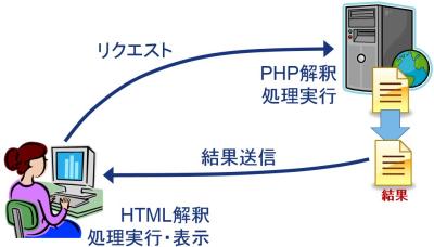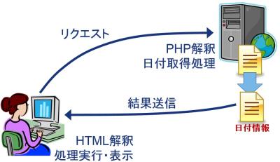 皆さんがブラウザでウェブページを閲覧するとき、ブラウザはサーバーに対し、HTMLやCSS、Javascriptなどのファイルを送信するようリクエストを送ります。ウェブサーバーは、そのリクエストを受け取ると、要求されたHTMLやCSS、Javascriptファイルをそのままクライアントに送信します。クライアントでは、受け取ったファイルのHTMLやJavascriptは「ブラウザが処理」して、結果を表示しています。 その意味では、より正確には、パソコンにインストールされているブラウザが開発環境になるので、それ以上に開発環境を整える必要がない、ということができます。 ![]() PHPはサーバーで処理されるしかしPHPは、クライアントからリクエストがあると、HTMLやJavascriptのようにファイルがそのまま送信されるのではなく、「サーバー側で処理」され、その結果のみがクライアントに送信されます。つまり、HTMLやJavascriptのファイル(~.htmlや~.js)は、サーバーにあるファイルとクライアントに届いたファイルは同じものですが、PHPのファイル(~.php)は、サーバーにあるファイルとクライアントに届いたファイルは違うものになります。 あくまでもイメージですが、HTMLの場合、サーバー上に「3+4」というデータがあるとすると、ブラウザで表示した場合もそのまま「3+4」と表示されますが、PHPの場合は、サーバー上で処理され、その結果の「7」だけがブラウザに送られて表示される、というような感覚です。 ![]() 日付処理の例で考える例えば、ウェブページにアクセスすると現在時刻を表示する、という処理を考えた場合、Javascriptを使って実現する方法と、PHPを使って実現する方法があります。SPONSORED LINK