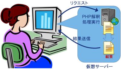 Javascriptを使う場合、プログラムはサーバーではなく、ブラウザで処理されますので、ブラウザがインストールされたパソコンの時刻がウェブページに表示されます。パソコンの時刻設定が間違っていれば、その間違った時刻が表示されます。 一方、PHPを使う場合は、プログラムはサーバーで処理されます。ブラウザには、その結果が送られてきますので、パソコンに間違った時間が設定されていても、サーバーの時間が表示される、ということになります。 ![]() ![]() 仮想サーバーで開発するとはいえ、開発環境を整えるためにサーバーを準備したり、開発途中のPHPプログラムをイチイチアップしたりするのは面倒です。不具合のあるプログラムをアップして問題が起きるのも避けたいところ。そこで、開発作業するパソコンの中に、仮想のサーバーを作って、パソコンで開発→仮想サーバーで動作確認→パソコンで修正→仮想サーバーで動作確認→パソコンで修正→・・・繰り返し・・・→仮想サーバーで完成確認(→完成したら実際のサーバーに公開)、という形で開発を進められると便利です。つまり、以下のようなイメージです。 ![]() というわけで、次に仮想サーバーを構築する方法を確認しましょう。 >>次のページへ進む