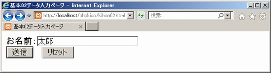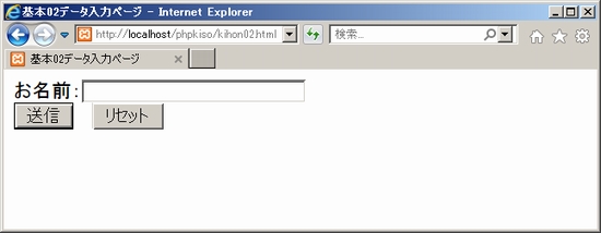 処理内容が理解できたら実行してみましょう。実行方法はlocalhost経由で「kihon02.php」にアクセスします。「http://localhost/phpkiso/kihon02.php」です。もちろん毎度のことながらXamppを起動してあることが前提です(詳しくはPHP開発環境準備編・Xamppの起動、Xamppの設定をご確認下さい)。どうですか?「こんにちは」と表示されればOKです。うまくいかない場合はよく見直して下さい。 ![]() 4. 変数の使い方上記のサンプルでは、文字列のデータを変数に直接代入する例を確かめましたが、別の変数から代入する場合や、文字列を結合する場合、数値を代入する場合などがあります。基本的な使い方を紹介します。●文字列を直接代入する場合 (変数$NAMAEに文字列「山田たろう」を入れる。文字列は「'~'」でくくる) ●変数から変数に値をコピーする場合 (変数$NAMAEの内容「山田たろう」を変数$nameにコピーする。コピーなので変数$NAMAEの内容はそのまま) ●文字列を結合して代入する場合 (変数$nameの中身「山田たろう」と「様」をピリオド「.」で結合し「山田たろう様」となったものを代入。この例では変数$nameに入れ直しているが他の変数でもよい。ピリオド「.」での結合は「変数と変数」や「文字列と文字列」でも可能) ●数値を直接代入する場合 (変数$NUMBERに30を代入。計算する数値はコーテーション「'~'」不要。文字として扱う場合は必要) ●計算して代入する場合 (変数$NUMの中身30と数値10から「30+30-10」を計算し結果の「50」を$NUMに代入。この例では$NUMに入れ直しているが他の変数でも可能) ●計算結果と文字列を結合して代入する場合 (文字列「金額:」と、計算式「$NUM*1.08」の計算結果を結合して$kingakuに代入。$NUMの中身が50なら計算結果は「54」となり「金額:54」という文字列が$kingakuに入る。計算式をピリオド「.」で結合する場合は計算式を丸カッコ()でくくる) ●変数の値を1増やす場合 (「$NUM=$NUM+1;」と同じ。$NUMの中身が数値50なら処理後は50に1が足されて$NUMは51になる。なお、変数の値を1減らす「$NUM=$NUM-1;」の場合は「$NUM--;」と書ける) 5. データ入力受付変数について理解できたところでデータ入力受付処理について確認しましょう。データ入力については、HTML復習編・入力フォームでやった<form>タグと、そのパーツとなる<input>タグや<textarea>タグを使って実現できます。そこでこのページの最初で作ったkihon02.htmlを以下のように編集しましょう。<body>~</body>タグの間に入力フォームを設置します。それからタイトルも「基本02データ入力ページ」としておきましょう。編集できたらブラウザでlocalhost経由で表示して下さい。 kihon02.html ![]() 説明します。まずデータ入力フォームですので、<form>~</form>タグで全体の大枠を設定しています。ポイントは、データ送信方式としてpostメソッドを指定し、データを渡す相手に「kihon02.php」というphpプログラムを設定していることです。 次に「お名前」のところ。<input>タグで、横幅半角30文字分のテキスト入力欄を作っています。この時、この入力データの識別名を「onamae」としているところも要確認です。 そして最後に<input>タグでこのフォームの送信実行(submit)ボタンと、フォームのリセット(reset)ボタンを設定しています。送信ボタンをクリックすると、<form>タグに指定したkihon02.phpが呼び出されて入力データが渡されることを想定しているわけです。 SPONSORED LINK
