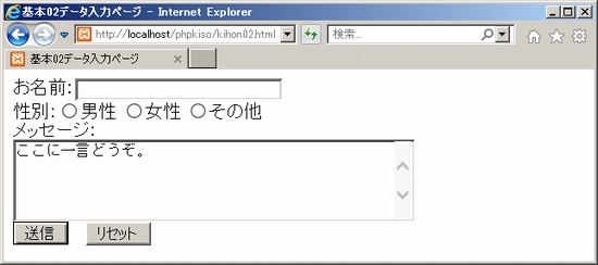 7. その他のデータ入力部品データ入力部品はもちろん他にもいろいろあります。比較的よく使うのはラジオボタンや長文を入力するテキストエリアがあります。ここではこの2つの動作を確かめましょう。まずデータ送信側ページkihon02.htmlに、以下サンプルの入力部品を追加して下さい。もちろん<form>~</form>の間です。あと入力欄の後に送信ボタンが来た方が良いので、送信ボタンの前ぐらいにタグを設置するのが良いと思います。kihon02.html(追加部分以外は省略) 意味は分かりますか?まず<input type="radio">はラジオボタンです。3つの<input type="radio">があり、それぞれ入力データvalueが「male」「female」「others」となっていますが、いずれも共通の名前「seibetsu」が設定されておりますので、ひとカタマリのラジオボタンとして処理されます。なお、タグの外側にある「男性」「女性」「その他」はブラウザ上の表示設定です。 またその下の「メッセージ」は<textarea>つまり複数行入力可能なテキストエリアになります。ここでは「otayori」という名前がつけられ、「ここに一言どうぞ。」という初期表示データが設定されています。 それぞれのデータの識別名ですが、当然ながら入力データによって異なる名前を付ける必要があります。seibetsu(性別)のデータがotayori(お便りメッセージ)として届いたり、逆になったりしたら困ります。表示は次の通りです。 ![]() 続いてデータ受信側PHPプログラムkihon02.phpを修正しましょう。定義済み変数$_POSTを上でやったのと同じように使います。どのようにすればよいか?kihon02.phpの<?php~?>の間。前に作った「~さん」を表示するecho命令の後に以下のサンプルを追加して下さい。 kihon02.php(追加部分以外は省略) 解説します。まずecho命令で<br>タグや「性別:」「メッセージ:」などが表示されるのはすでに問題ないと思います。また$_POSTでデータを受信しています。その際、送信元のhtmlに設定されたデータ識別名称「seibetsu」「otayori」を指定する必要があります。 それでは表示してみましょう。ただこの「kihon02.php」にいきなりアクセスしてもダメです。$_POSTにデータが入っていないとエラーが表示されます。まず「kihon02.html」にアクセスしてデータを入力し、送信ボタンをクリックして「kihon02.php」にデータを渡さなくてはなりません。 というわけで次のように適当にデータを入力して「送信」実行してみてください。うまくいけば「kihon02.php」画面に入力したデータが下のイメージのように表示されるはずです。 ![]() ![]() 試してみて気づいた人もいると思いますが、上記の出力イメージにもある通り、テキストエリアで入力した際にはあった「改行」が出力時にはなくなっています。それは入力時に入力したエディタでの「改行」がHTML用の改行である<br>になっていないからです。実際にはPHPプログラムでこれらを置き換え処理すれば良いのですが、この方法についてはまた後の資料で確認します。今はこれでOKです。 それから他にも入力フォームにはチェックボックスがあります。ただチェックボックスは複数選択を想定しているため、届くデータが複数でかつ増減する可能性があり、取り扱いが難しいんです。例えば「好きな季節」を選ぶチェックボックスでは「春だけ」を選ぶ人もいれば、「秋・冬」を選ぶ人や、全部を選ぶ人もいるでしょう。その場合、送られてくるデータは1つ~4つまで変化します。実はこれを受け取るためには「配列」という特殊な変数を使う必要があります。というわけで、チェックボックスからのデータ送受信については、PHP基本編・配列のところで確認します。 8. postメソッドとgetメソッドここまで、postメソッドによるデータの受け渡しを見てきましたが、もう一つ。getメソッドという方法もあります。これについても確認しましょう。postメソッドは、<form>タグとその他のデータ入力部品を使ってデータを送る方法だったのに対し、getメソッドは、URLを使ってデータを送る方式になります。サンプルを見てみましょう。試す場合は、上でやったのと同じように、ひな形ファイルhina.htmlを2回コピペして、それぞれをget.htmlとget.phpと名前を変更し、エディタで開いて編集しましょう。 get.html get.php 少し解説します。まず「get.html」では、<a>タグを使ってget.phpにリンクを設定しています。ここで、href属性に「get.php?nickname=ジャイアン」と指定されていることを確認して下さい。つまり、リンクから「get.php」にアクセスする際に、その後ろに「?nickname=ジャイアン」すなわち「?」マークと「nickname」という識別名、「=」(イコール)でつないで、データ「ジャイアン」を設定している、ということです。あるいは「渡すデータとその識別名をくっつけて送信先ページを呼び出している」という方が分かりやすいかもしれません。以下イメージで書き方を確かめましょう。上記サンプルでは相対パスで書かれていましたので「http://localhost/phpkiso/」は省略されていましたが、フルパスで指定すると以下