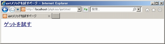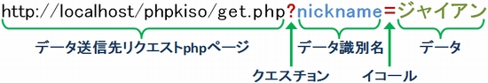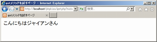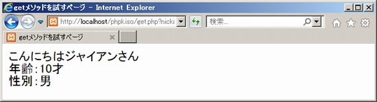 一方、「get.php」では、「$_GET['nickname']」というものが使われています。どこかで見たぞ、と思いましたか?そうです、postメソッドと同じ形式です。postメソッドが「$_POST」なので、本当にpostをgetに変えただけになっています。さらには使い方も同じ。getメソッドで送られたデータは、「$_GET['データ識別名']」によって受け取ります。もちろんデータ識別名は、送り元と合わせる必要があります。 それではこれをサーバーlocalhost経由で実行しましょう。送り元の「get.html」では「ゲットを試す」というリンクがあるだけ。リンクをクリックすると「get.php」に展開し「こんにちはジャイアンさん」と表示されます。 ![]() ![]() このときget.phpが表示されたブラウザのURLを見てください。「~get.php?nickname=ジャイアン"」と表示されていませんか?URLで送る方式ですので、何を送ったかが見えてしまっているというわけです。 では、getメソッドで複数のデータを送りたい場合どうするか?以下のサンプルのようにします。「&」でつなげて「データ識別名=データ」を書くだけ。つまり、「?nickname=ジャイアン&nenrei=10&danjo=男」という感じ。サンプルでよく確かめて下さい。 get.html(基本タグは省略) get.php(基本タグは省略) 間違いがなければ以下の通り出力されます。URLにもデータがチラっと見えてますね。自分の手で試してみましょう。 ![]() 練習問題このページで用いたファイルkihon02.htmlとkihon02.phpを使い、以下の課題に取り組みましょう。