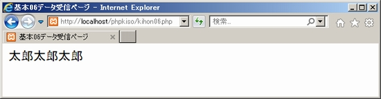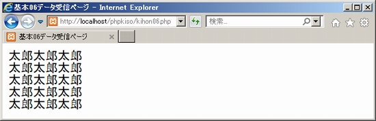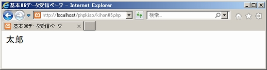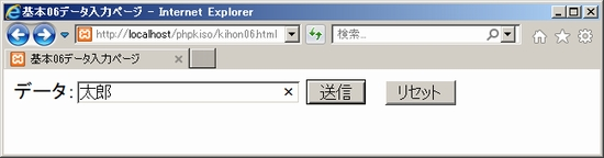 1. 準備これまでと同じくサンプル用のhtmlとphpファイルを作成します。[Xamppフォルダ]→[htdocsフォルダ]→[pkpkisoフォルダ]で、ひな形ファイル「hina.html」を[Ctrl]+[c]し、[Ctrl]+[v]を2回すると2つコピーができますので、それぞれの名前を「kihon06.html」と「kihon06.php」に変更。それぞれ以下のように編集します(ここで時間をかけても仕方ないのでコピペでOK)。kihon06.html kihon06.php 念のため内容を確認すると、まずkihon06.htmlでは<form>タグでkihon06.phpにデータを送る設定をし、そのデータ入力部品として<input type="text">と送信ボタン<input type="submit">、リセットボタン<input type="reset">を設置してます。一方、kihon06.phpでは、$_POST(postメソッド)でデータを受け取り、変数$dataに代入しています。データ送受信の対応を確認しましょう。その上で「$data」の内容を1回だけ表示しています。 SPONSORED LINK