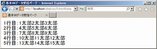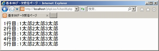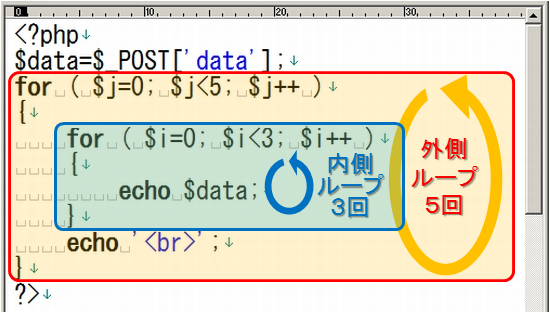 4. 繰り返しの入れ子if文による条件分岐と同様に、繰り返し処理も入れ子にすることができます。つまり「Aを3回繰り返す処理、を5回繰り返す」という処理です。わかりやすく言えば「1日3回ケーキ、を5日間繰り返す(太る)」ということです。かえってわかりにくい気もするので、サンプルで確かめましょう。kihon06.php(php部分以外は省略) forループが2重になっているのがわかりますか?色分けすると次のようになります。 ![]() まず3行目の「for()」です。これは2重のforループの外側です。「$j=0」から始まり「$j++」で1ずつ増やして「$j<5」の間、つまり$jが0→1→2→3→4の5回、続く{ }内を繰り返す、という内容です。上記の色分けで言うとオレンジ部分を5回繰り返すわけです。変数は$j(ジェイ)ですので要確認。 そしてこの外側forループの{ }内。ここには2つ。内側forループとecho命令があります。 1つ目は内側forループ。5行目からのブルー部分の「for(){~}」です。ここでは「$i=0」からスタートして「$i++」で1ずつ増やしながら「$i<3;」の間、つまり$iが0→1→2の3回、その後の{ }内の「echo $data;」を繰り返すよう指定しています。こっちの変数は$i(アイ)です。この内側forループは、よく見ると一つ前のサンプルのforループと同じものをインデント(字下げ)しただけのものです。 2つ目はecho命令。サンプル下から3行目の「echo '<br>';」です。改行タグ<br>を出力しているだけですが、この位置関係、わかりますか?内側forループの{ }の外だけど外側forループの{ }中には入っています。つまり3回繰り返す小さなループには入ってないけど、5回繰り返す大きなループには入っているわけですね。内側forループで$dataの出力を3回繰り返した後に、改行タグ<br>を1回出力するということになります。 そしてこれらの2つの処理「$dataを3回出力して、<br>を1回出力する」という処理を外側forループとして5回繰り返しています。ですので$dataは、3つ表示が5回行われるということで、合計15回出力されることになります。 編集が済んだら処理を確かめましょう。localhost経由で「kihon06.html」を開いてデータを入力して「送信」します。「kihon06.php」ページに展開し入力データが3回ずつ5段に表示されましたか?うまくいかない場合はどこかに間違いがあるはず。順を追ってよーく確かめて下さい。 ![]() 5. 繰り返しカウント数の利用forループ文では、指定された繰り返し回数を実現するために、繰り返し回数をカウントしています。上のサンプルで「$i++」とか「$j++」とか出てきましたよね?そしてこの回数の値は単にカウントするだけじゃなく、表示したり計算したりほかの処理に使ったりすることができます。例えば、次のような番号を出力したい場合です。![]() 「2行目」とか「3太郎」とか番号が表示されていますよね?このような番号はfor文の繰り返し回数を設定する変数を使って出力することができます。どうやって使うか?サンプルで確かめましょう。 kihon06.php(php部分以外は省略) まず「for()」の繰り返し設定は一つ前のサンプルと同じ。内側forループが3回、外側forループが5回繰り返すよう設定しています。ここで追加したのは、それぞれの繰り返し内容を指定する{ }内です。 まずは簡単な内側forループから見ていきましょう。8行目に「echo $i+1;」が追加されています。これはわかりますね?「$i+1」の計算結果を表示しなさいというecho命令です。変数$iは、ここでは内側forループの繰り返し回数を管理する変数で、0→1→2と変化します。そこでこれを使って番号を表示しているわけです。もちろん「$i+1」と1を足されている理由は、番号なので1→2→3としたいからです。その次の行では「echo $data;」が設定されていますので、上記のイメージの通り、改行もなく横並びに「1入力データ2入力データ3入力データ」と表示されるわけです。 続いて外側forループの{ }内を見ましょう。ここでは5行目に「echo ($j+1).'行目:';」というのがあります。これは「($j+1)」の計算結果と「~行目:」という文字列を結合して表示せよというecho命令です。計算式が「($j+1)」と「()」でくくられていますが、これは計算結果を「.」(ピリオド)で文字列と結合するため、計算式をまとめるために使っています(ないとエラーになります)。詳しくはPHP基本編・データ受渡しと変数を見て下さい。 他は上で見たサンプルと同じです。内容は理解できましたか?理解できたら動作確認しましょう。localhostサーバー経由でkihon06.htmlにアクセスします。データを入力して送信してみて下さい。上のイメージのようになったらOKです。 SPONSORED LINK