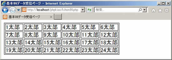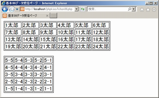6. 計算式の活用ここまでforループの繰り返し回数をカウントする変数を使って番号を表示しましたが、繰り返しにとらわれず、もっと自由に番号を付けたり、活用したりしたいということがあります。例えば、上のサンプルでは、表示する各行を「1太郎2太郎3太郎」「1太郎2太郎3太郎」・・と1、2、3番を繰り返して表示しましたが、「1太郎2太郎3太郎」「4太郎5太郎6太郎」「7太郎8太郎9太郎」・・・と通し番号を付けたい場合もあるはずです。この場合でも繰り返し回数の変数「$i」や「$j」を使って、内側forループの{ }内、8行目の「echo $i+1;」の代わりに「echo $j*3+$i+1;」とやれば通し番号を表示できます(なぜそうなるかは考えてみて下さい)。でも、このようなやり方はちょっとややこしい。ということで、表示用の計算式を作ってしまおうという安易な・・・いや賢いやり方を考えましょう。サンプルを次のように編集します。 kihon06.php(php部分以外は省略) 内容を確認します。まず3行目に「$bango=0;」を追加しました。これは数値のゼロを変数$bangoに代入する、ということですね。問題ないと思います。 もう一つ追加したのは、内側forループの{ }の中。9行目の「$bango=$bango+1;」です。これは変数$bangoの値に「1」を足してまた変数$bangoに代入している、ということです。これもOKでしょう。なおこれは短縮形で「$bango++;」としても同じ結果になります。 そして続く10行目。echo命令の内容を修正して変数$bangoの内容を表示するように「echo $bango;」としてあります。 この処理を実行するとどうなるかわかりますか?まず、postメソッドでデータを受け取り、変数$bangoにゼロをセットします。外側forループの1周目で「1行目」と表示します。内側forループは3回繰り返しますが、その1回目で$bangoの値は元々の0(ゼロ)に1を足すので1になり、2回目では1に1を足すので2になり、3回目では3になります。それぞれ表示して内側forループが終わって、外側forループが2周目に入ります。 外側forループの2周目では、やはりまず「2行目」と表示し、内側forループを3回繰り返します。1回目では、$bangoの値が3になっているので1を足して4になり、2回目で5になり、3回目で6になります。内側forループが終わって、外側forループの3周目へ・・・・という具合に$bangoの値は最後には15になり、1~15の通し番号が完成します。最初は頭がグルグルしてくるかもしれませんが慣れればわかってきます。 編集が済んだらlocalhost経由で動作確認して下さい。間違いがなければうまくいくでしょう。 ここでは、繰り返し回数を管理する変数や、表示する数値を求めるための計算式を使って、数字そのものを表示するために使う例を確認しましたが、このような数値はHTMLタグの属性値として使うこともできます。いろいろ使う機会もあると思うので是非マスターしておきましょう。 ![]() 7. テーブルの出力繰り返し処理の最後はテーブルの出力です。テーブルを何度も表示するのではありません。繰り返し処理でテーブルを生成します。SPONSORED LINK