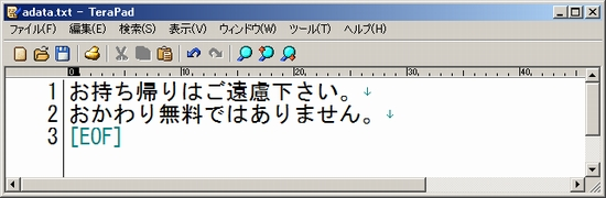 4. ファイルからの読み込みサーバーに保存されたテキストファイルを読み込む方法はいくつかありますが、ここでは取り扱いが簡単なfile()関数を紹介します。簡単ですし、これでほぼ十分でもあります。file()関数は「テキストファイルの内容を全て読み込み、1行ずつ配列に格納してくれる関数」です。配列に格納されれば、編集したり、計算したり、表示したりすることが容易にできます。 「1行ずつ」という事は、一連のデータの「改行」がある所までが「1行」として扱われるという事です。この場合の「改行」はHTMLの改行タグ<br>ではなく、Terapadやメモ帳等テキストエディタで行が変わる「改行」です。Terapadなら「改行」の表示設定がしてあれば、各文末に「↓」(下矢印)の改行マークが表示されますが、これのことです。上でも見たように、PHP的には「¥n」ですね。つまり、テキストファイルに書かれた1行1行には、その最後に目には見えない「¥nという記号で表される改行」が付いているということです。例えば、テキストファイルに・・・
