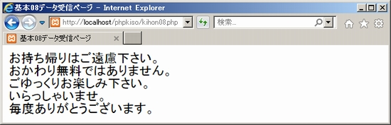 と書いてあることになります。 というわけで、file()関数でテキストファイルの内容が1行ずつ配列に格納される、というのはまさにこの「当店では」「大盛りサービスは」「やってません」が、それぞれ配列の要素として設定されることを意味します。この場合は、テキストファイルが3行から成るので、配列の要素は3つになります。以下のサンプルを見て下さい。 kihon08.php(php部分以外は省略) 解説します。一つ前のサンプルの最後のecho文を削除して、7行目から新たに書き加えています。 7行目ではさっそく「file()」関数が使われています。ここでは「$contents = file($filename);」ということで、$filenameに指定されたファイル「adata.txt」の内容を読み込み、変数$contentsに設定しています。このとき、ファイルの各行は分割されて配列の各要素に割り当てられますので、$contentsは配列になります。 そして次からのforeachループ。配列専用の繰り返し処理命令でした。前の資料PHP基本編・配列にありましたね。指定された配列のすべての要素について1件ずつ取り出し処理していきます。配列$contentsのすべての要素、つまり、ファイル「adata.txt」のすべての行を1行ずつ取り出して処理します。続く{ }内にecho命令が指定されていますので、ファイルのすべての行が改行タグ<br>とともに出力されることになります。 できたところで、実際に動作させて確認してみましょう。先と同様kihon08.htmlに「localhost」経由でアクセスしメッセージを送ります。kihon08.phpが表示されメッセージの一覧が表示されたらOK。何度か繰り返してみて下さい。どんどん一覧のリストが追加されてけば完璧です。 ![]() ![]() file()関数の他にも、先に示したfopen()とfclose()関数と一緒に使うfgets()関数や、fopen()とfclose()が不要でテキストファイル全部をまとめて読み込むfile_get_contents()関数、同じくfopen()とfclose()が不要でテキストファイル全部をまとめて読み込んで表示するreadfile()関数などもあります。ただ、file()関数さえ知っていればほぼ事足ります。ここでは紹介しませんが必要があれば調べてみて下さい。 SPONSORED LINK