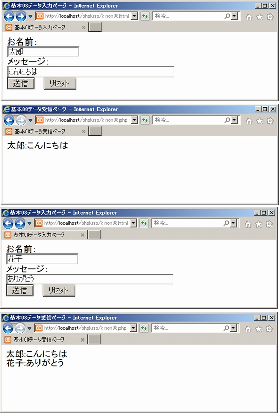 練習問題このページで用いたファイルkihon08.htmlとkihon08.phpを使い、以下の課題に取り組みましょう。