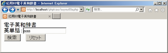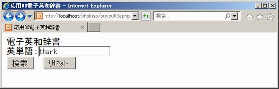 それから英和辞書データouyou03d.txtは、こちらから右クリックして保存して下さい。自己解凍形式の圧縮ファイルになっています。ダブルクリックして解凍して(自己解凍キーはPHP100%)、他のファイルと同じphpkisoフォルダに保存しておいて下さい。 一方でほかのファイルも準備しておきましょう。まず検索履歴データouyou03c.txtは中身をクリアしておく必要があります。テキストエディタ(Terapad等)にドロップ&ドラッグして開いてすべて削除して上書き保存して閉じましょう。 次に、入力&結果出力画面ouyou03a.phpと、検索&履歴データ登録画面ouyou03b.phpです。テキストエディタで開いて以下のように編集します。応用編では他の資料と同様に「■■■」で伏字にしてあります。「■■■」が3文字とは限りませんので何が入るか考えましょう。 ouyou03a.php ouyou03b.php 大丈夫と思いますが念のため説明します。まずouyou03a.php。一応PHPファイルとなっていますが実質的にはPHPスクリプトはなく、HTMLだけの内容になっています。これまでの資料で何度も出てきているデータの受け付けを<form>タグと<input>タグなどで実装しています。英単語データの入力を受け取り、postメソッドでouyou03b.phpに向けて送信することになっています。「■■■」は簡単なので思い出して下さい。 続いてouyou03b.phpです。HTML部分はOKですが、PHPスクリプトの最初のところが少し難しく感じるかもしれません。でも一つ前の資料で簡易掲示板を作った時にもやったのでぜひ思い出してほしいところ。postメソッドで届いたデータを受け取り、無害化した上で変数に代入しています。postメソッドの受け取り変数を、無害化の関数の中に直接設定しています。つまり「■■■」は・・・わかりますね。わからない人は、PHP基本編・データ受け渡しと無害化の説明を確認しましょう。 SPONSORED LINK