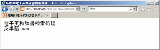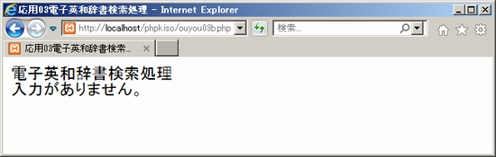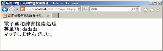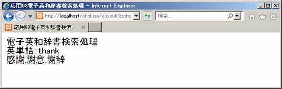 できたらXamppが起動していることを確かめた上で、ブラウザから「localhost/phpkiso」にアクセスしouyou03a.phpを開いてみて下さい。適当な英単語を入れてみて送信すると「英単語:~」と表示されればOK。ouyou03b.phpから戻る仕組みはまだないのでブラウザの戻るボタンで戻って下さい。未入力の場合や、<font size="7">のようなタグが入力された場合も確かめておきましょう。 ![]() ![]() ![]() 2. 検索処理ここからが電子英和辞書のキモ。検索処理です。どのように作ったらよいでしょうか。英和辞書データouyou03d.txtは、既にダウンロードして保存しましたので、これを読み込んで、入力された英単語の文字列と比較し、一致するものを出力する、というのが基本的な流れになります。なお、英和辞書データouyou03d.txtは、内容を見ていただくとお分かりの通り、「<>」で区切られた「英単語<>意味」という形式の1行1件のデータになっています。というわけで、ouyou03b.phpを次のように編集しましょう。 ouyou03b.php(php部分以外は省略) 内容を確認しましょう。最初の6行は先ほどと同じです。修正したのはelse以下の{ }内の2行目からです。 まず6行目のecho命令で入力された単語データを表示した後、7行目で「$imi = 'マッチしませんでした。<br>';」としています。つまり変数$imiに「マッチしませんでした」という文字列を設定しているわけです。これは辞書データの全てを調べた結果、マッチしなかった場合のメッセージです。なぜここで設定しているかは続きを見ていくとわかってきますので、とりあえず一旦置いておきましょう。 次に、辞書データファイルouyou03d.txtを読み込んでいます。「■■■」は関数ですが何が入るでしょうか。コメントにある通りファイルを読み込んで配列に指定する処理です。「$dictdatalist」は配列です。わかりますよね。 続いてforeachループです。今設定した配列「$dictdatalist」のすべての要素を一つずつ$valueに代入して処理していきます。 foreachループの中では、まず$valueの内容を「<>」という記号で分割し、分割された要素を配列「$dictdata」に格納しています。辞書データファイルには「英単語<>意味」という形式で辞書データが設定されていましたので、英単語が「$dictdata[0]」に、意味が「$dictdata[1]」に入れられます。ですのでここでの「■■■」は、文字列を区切り記号で分割して配列に格納する関数が入ります。 そしてif文です。入力された単語の文字列が入った$tangoと、辞書データファイルから順に読み込んだ単語データの$dictdata[0]を比較しています。「==」(イコール2つ)ですので両辺が同じであれば、$imiに$dictdata[1]の内容つまり「意味データ」を代入した上でforeachループを終了させています。「■■■」はループを中断して抜ける関数です。元々$imiには「マッチしませんでした」という文字列が入っていましたが、マッチした時点で辞書データから取得した意味データで書き換えられることになります。ですのでループ後の「echo $imi.'<br>';」では、マッチした意味データが表示されます。 ではif文で同じデータがなかった場合はどうなるでしょうか。foreachループの最後までいってマッチするものがなかったとすると、$imiの内容は書き換えられず「マッチしませんでした」という文字列のままです。ループ後の「echo $imi.'<br>';」では「マッチしませんでした」と表示されます。最初のところで$imiに「マッチしませんでした」という文字列を設定していたのはこのためです。 完成したら実行してみましょう。「localhost」経由でouyou03a.phpにアクセスして英単語を入力してみて下さい。意味が表示されましたか?うまくいったら今度は適当な文字列を入れてみましょう。「マッチしませんでした」と表示されたらOKです。 ![]() ![]() ![]() ![]() SPONSORED LINK