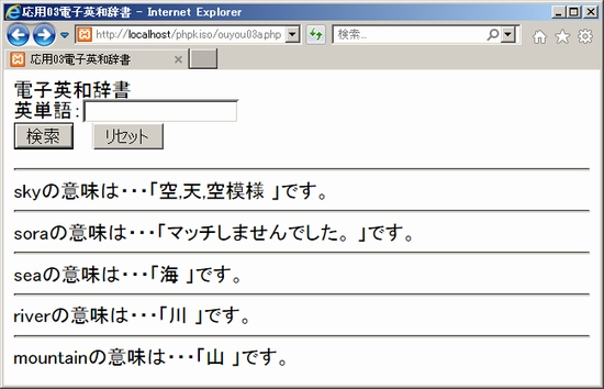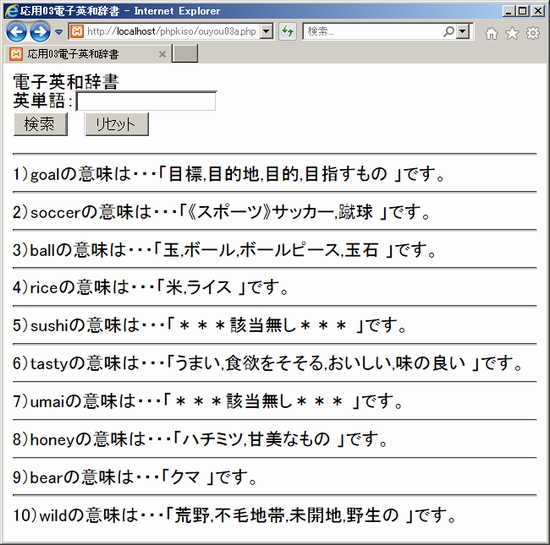 5. 検索履歴の表示今回作る電子英和辞書は、検索履歴を表示する仕様にすることにしていました。検索文字列の入力欄の下に、これまで調べた英単語と意味のセットをずらっと並べたい、ということです。検索履歴のデータファイルはouyou03c.txtとしてすでにできています。追記モードでデータを追加していきますので、このファイルの中には、古いものから下方向へ新しい履歴が並び、最後が一番新しい検索結果、ということになります。検索履歴もそのまま同じように表示すれば簡単ですが、検索履歴が増えてくると最新の検索結果が下の方に行ってしまうので不便です。ですので表示は、新しいものを上に、古いものが下に来るように逆順に並べ替えたいと思います。 処理の流れとしては、まずouyou03c.txtを読み込んで配列に格納。配列を逆順にして順に表示していく、という形になるでしょう。というわけでサンプルを見ましょう。 ouyou03a.php(php部分以外は省略) 順に見ましょう。まず最初のところ。検索結果の履歴が保存されたouyou03c.txtを読み込んで配列$rirekilistに保存しています。「■■■」はファイルを読み込んで1行ずつに分けて配列に格納する関数です。上でも登場しました。 次に配列$rirekilistを逆順に入れ替えています。「■■■」は、簡易掲示板を作る資料にも出てきた関数です。配列をリバースするやつを思い出して下さい。 その上でforeachループを使って、配列$rirekilistの要素を取り出して処理しています。このとき検索文字列と検索結果を別々に表示するために、両者を区切り記号「<>」で分割して配列$rirekiに格納しています。検索履歴のデータは「検索文字列<>検索結果」という形式で保存されていますので$rirekiの要素は2つ。$rireki[0]と$rireki[1]にデータが保存されます。ここの「■■■」も再び登場です。もう覚えましたか? できたらlocalhost経由でouyou03a.phpにアクセスしてみましょう。ouyou03c.txtの履歴データが残っていれば(消されてなければ)、検索文字列の入力欄の下にこれまでの検索履歴が新しい順に表示されるはずです。以下は出力イメージです。検索文字列がヒットしない場合が「マッチしませんでした。です」となっているのが変ですがそこは少し工夫すれば改良できますので、とりあえずこれでOKとしましょう。 ![]() 6. ページのリダイレクト完成に近づいてきましたがもう一つ。辞書データを検索しつつ、検索結果を履歴データファイルに保存するouyou03b.phpから入力画面に戻る仕組みが実装されていません。前の資料の簡易掲示板のように、最後のページでトップページへのリンクや戻るボタンを設置する方法もありますが、今回は電子辞書ですし、検索文字列の入力画面に、検索文字列と結果のセットが表示されるようにしましたので、いちいちクリックして戻るのは面倒・・・ユーザーフレンドリーではありません。というわけで、ouyou03a.phpから検索文字列を入力してouyou03b.phpに移ったらすぐに検索&履歴登録処理と同時にouyou03a.phpに戻るリダイレクトの仕組みを作りたいと思います。実際に使うと、検索文字列の入力画面で英単語を入力したらそのまま同じページ内に英単語と意味のセットが追加表示される、というような感じになります。 SPONSORED LINK